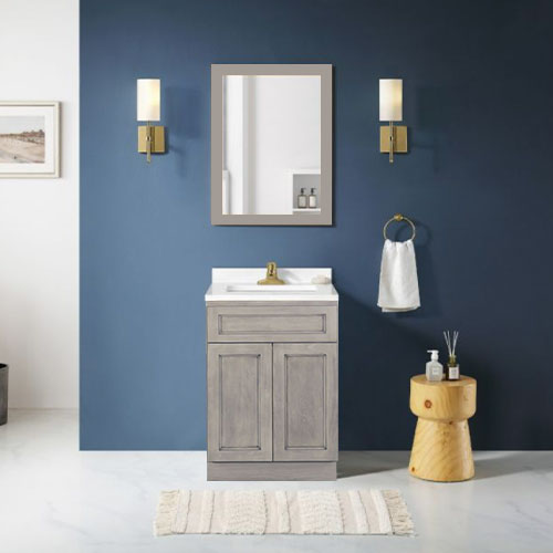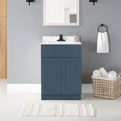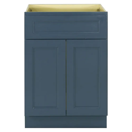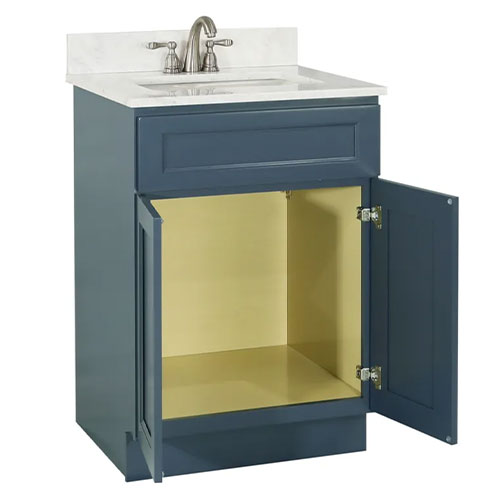 The Aurafina Blair Vanity Collection from Builder Supply Outlet is available in Pacific Blue, Cunningham White, Old Harbor Grey, Forest Green and Sandalwood. These vanities will match any countertop you choose from our wide selection of granite and quartz tops! With all wood dovetail constructed drawers, these vanities were built to last! Soft close doors and drawers are a standard feature. This 24" vanity is 24" wide, 21" in depth and 34.5" in height. Don’t forget your vanity top, sink and faucet to complete your bathroom project! Update your bathroom with the Aurafina Blair Collection found at Builder Supply Outlet.