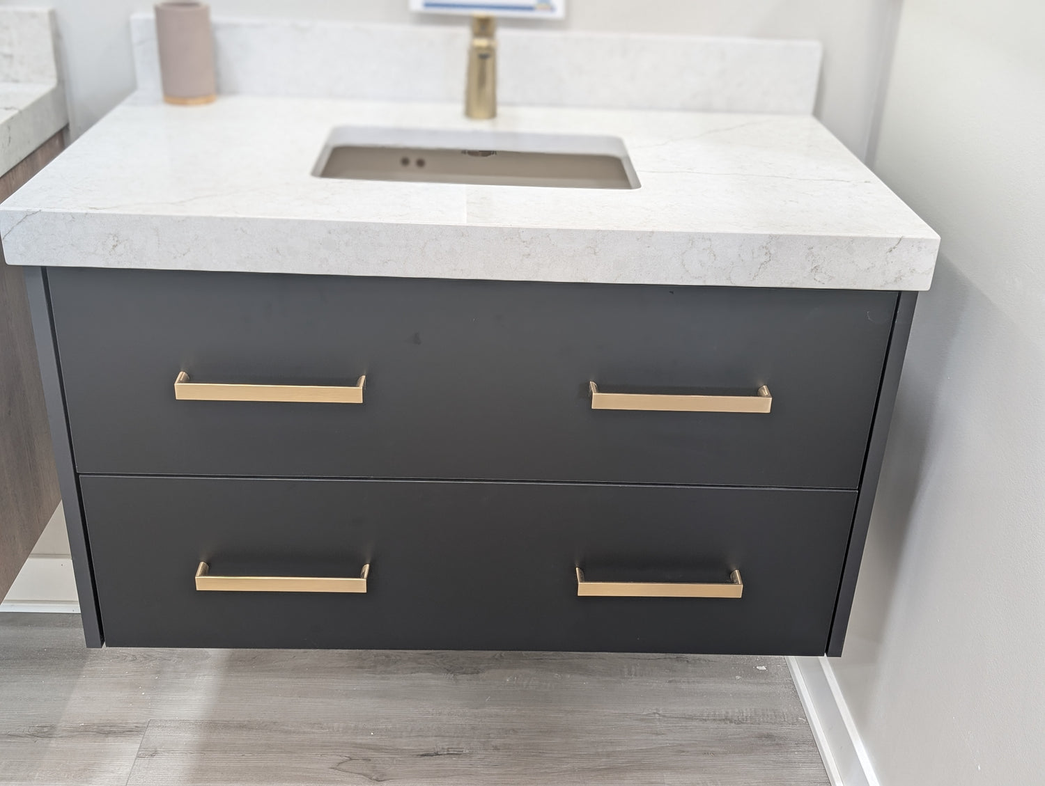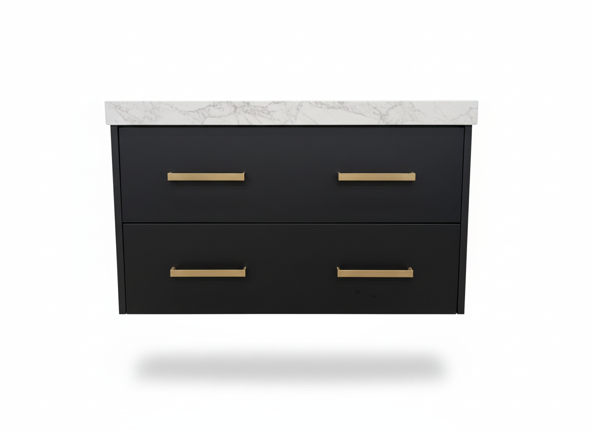 Transform your bathroom with the Prior Creek Matte Black Hanging Vanity. This stunning, modern floating design instantly opens up your space while delivering premium durability and craftsmanship. Built with all-wood construction, it features dovetail drawer joints and soft-close technology for reliable, quiet function. The vanity is finished with heat-treated Melamine for exceptional moisture resistance and clean, matte MDF door fronts. Best of all, this high-quality piece is in-stock and ready for immediate pickup, so you can enjoy your elevated bathroom sooner.