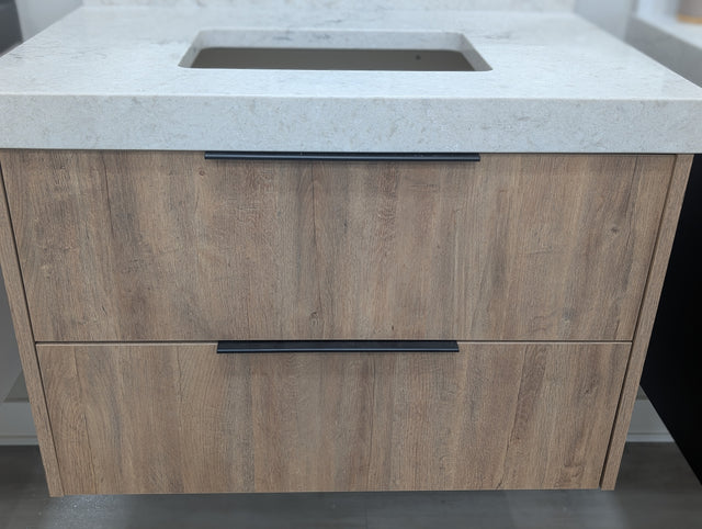 Transform your bathroom with the Prior Creek Oak Hanging Vanity. This stunning, modern floating design instantly opens up your space while delivering premium durability and craftsmanship. Built with all-wood construction, it features dovetail drawer joints and soft-close technology for reliable, quiet function. The vanity is finished with heat-treated Melamine for exceptional moisture resistance and clean, matte MDF door fronts. Best of all, this high-quality piece is in-stock and ready for immediate pickup, so you can enjoy your elevated bathroom sooner.