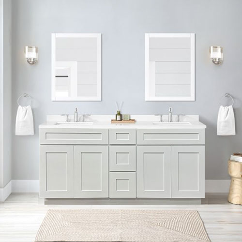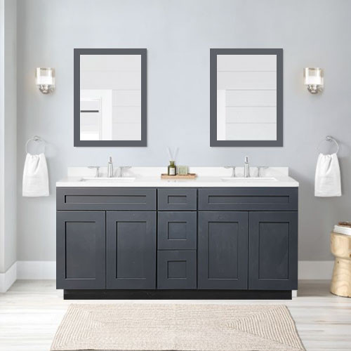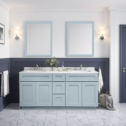 The Prior Creek Kinzie Collection from Builder Supply Outlet is available in Iceberg Grey, Navy Blue and White. These vanities will match any countertop you choose from our wide selection of granite and quartz tops! With all wood dovetail constructed drawers, these vanities were built to last! Soft close doors and drawers are a standard feature. This 72" vanity is 72" wide, 21" in depth and 34.5" in height. Don’t forget your vanity top, sink and faucet to complete your bathroom project! Update your bathroom with the Kinzie Collection found at Builder Supply Outlet.
