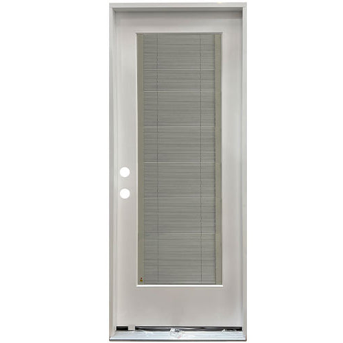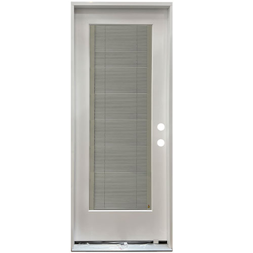 Replace your back door with this flushed glazed full lite with blinds single fiberglass prehung door in white! This prefinished fiberglass door is 1-3/4″ thick and won’t warp, rot, dent or split. This door is equipped with an energy-saving, insulating, foam polyurethane core that reduces sound transfer. Hung in a composite 4-9/16″ door jamb with a left hand inswing. Fully weather stripped and has low-E insulated glass for energy efficiency! Get yours today only at Builder Supply Outlet!